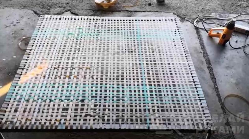 С помощью строительного фена делаем термоусадку. Это нужно для того, чтобы сетка стала более упругой.