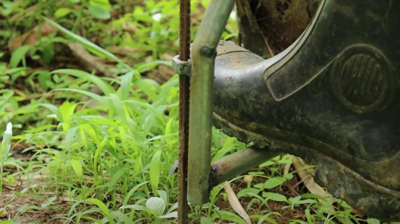 К нижней части одной из опор нужно приварить квадратный пруток (для жесткости), а ко второй — круглый пруток (колесная ось) и надеваем на него два колеса, изготовленных ранее.