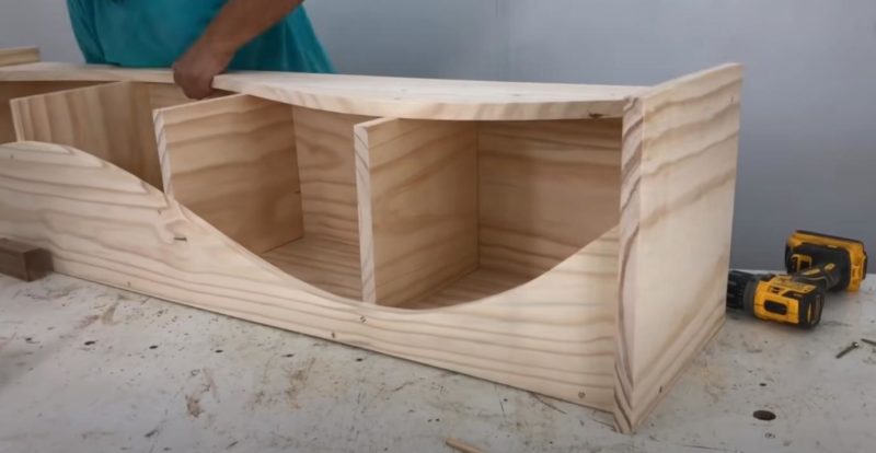 На последнем этапе останется только сделать основание и боковые стенки, прикрепить лицевую панель и крышку с тыльной частью, и прикрепить ножки. Потом все это нужно покрасить.