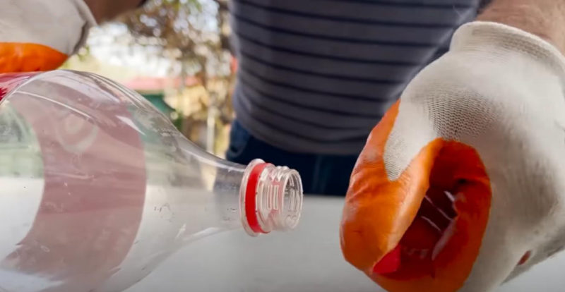 Берем одну из пластиковых бутылок и делаем в ней прорезь. Затем нагреваем конец гвоздя и проделываем в бутылке отверстия.