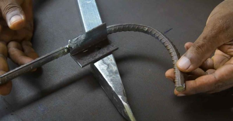 Отрезаем кусок рифленой арматуры, и сгибаем у него один из концов. По такому же принципу делаем и вторую заготовку.