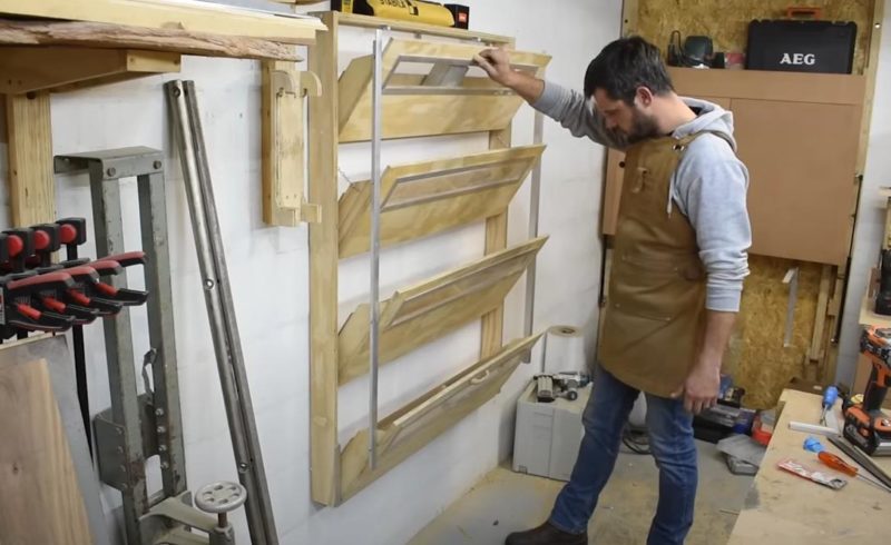 Подробно о том, как сделать органайзер для мастерской в виде откидных полок, рекомендуем посмотреть в авторском видеоролике ниже.